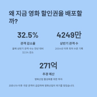 이번 문화체육관광부와 영화진흥위원회가 6,000원 할인권 450만장 배포와 이에 따른 영화관 앱 서버 마비, 신청자 폭주 사태는 영화 시장의 ‘뜨거운 관심’을 방증합니다.