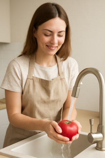 - 식초물 세척: 물 1L에 식초 한 스푼을 넣고 5분간 담근 뒤 헹굼