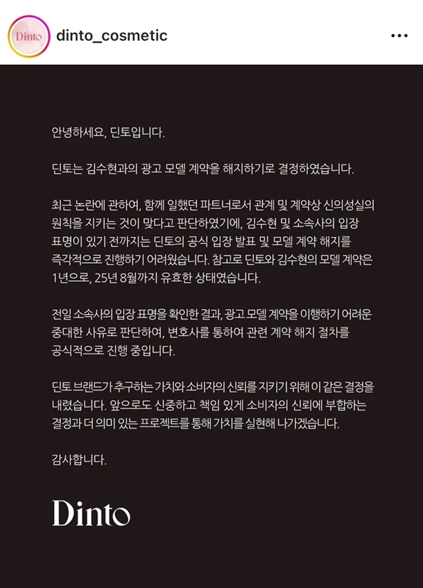 딘토(Dinto): 뷰티 브랜드 딘토는 김수현과의 광고 모델 계약을 공식적으로 해지했습니다. 소비자 신뢰와 브랜드 정체성 보호를 위한 결정이라고 밝혔습니다.