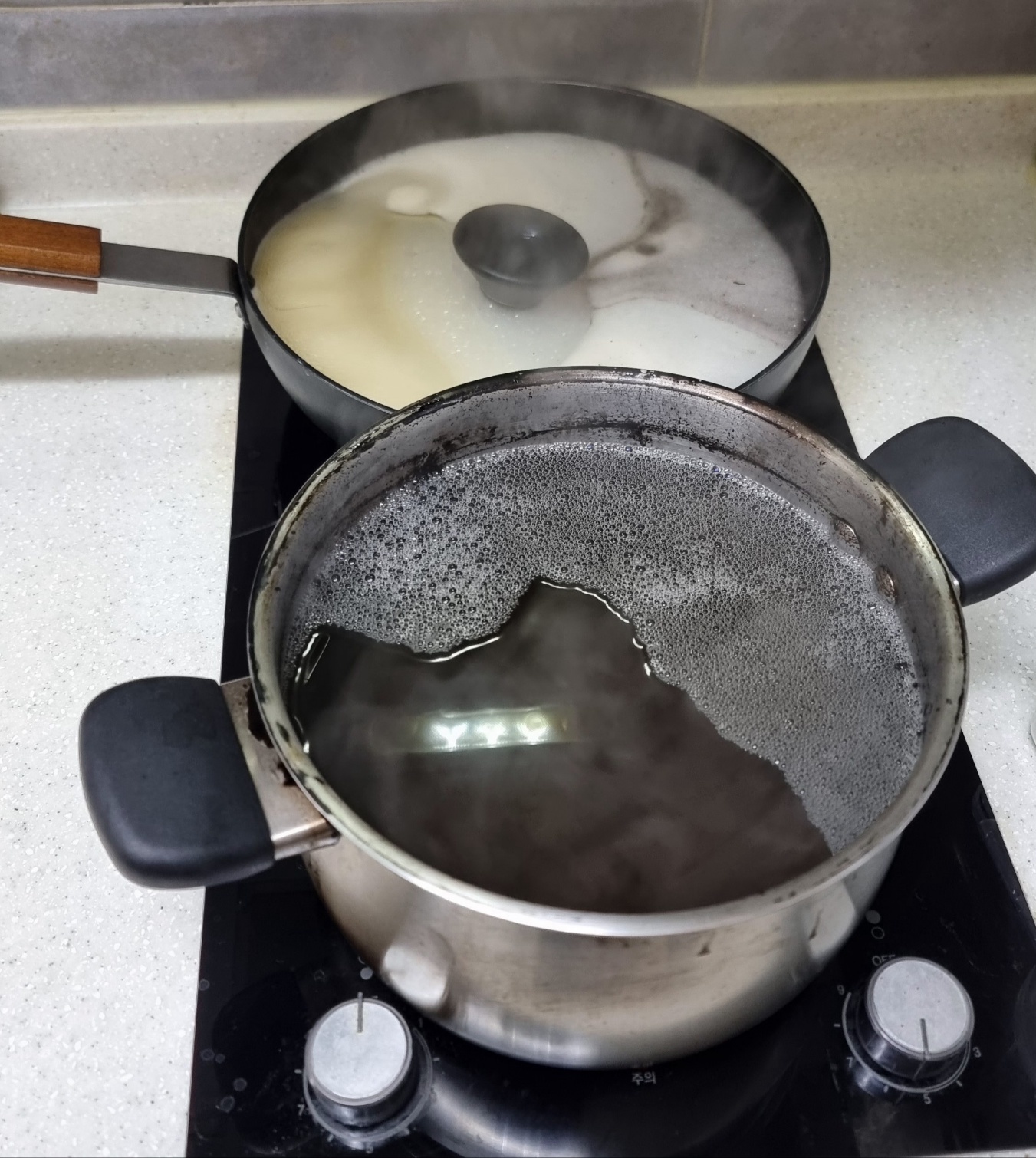 - 냄비 안에 물을 절반 이상 붓습니다.