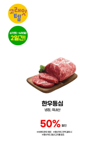 | 한우 1+ 등심 (100g) | 9,800원 | 4,900원 | 이마트앱 쿠폰 적용 시 |