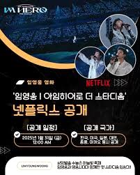 임영웅의 '아임 히어로 더 스타디움'은 2024년 2월 1일 0시부터 넷플릭스에서 독점 스트리밍됩니다. 트로트 황제 임영웅의 첫 단독 콘서트이자, 역대 최대 규모의 공연을 놓치지 마세요.