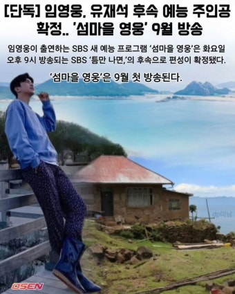 9월 예정인 SBS 신규 예능 <섬마을 영웅>에서 임영웅의 출연이 공식 발표됐습니다.이 프로그램에서 임영웅은 바쁜 일상을 벗어나 절친들과 함께 섬마을에서 힐링하며, 진솔한 우정과 감동을 선보일 예정입니다.