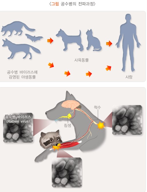 공수병(광견병)은 감염된 동물의 침에 의해 전파되는 치명적인 바이러스성 질병입니다.
