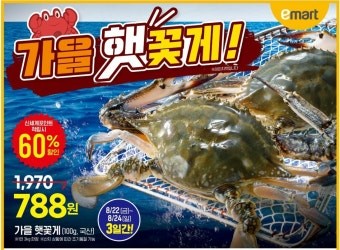 - 햇꽃게(100g)는 9월 4~5일 신세계 포인트 적립 시 60% 할인된 788원에 판매되어, 10년 전 가격보다 저렴합니다.