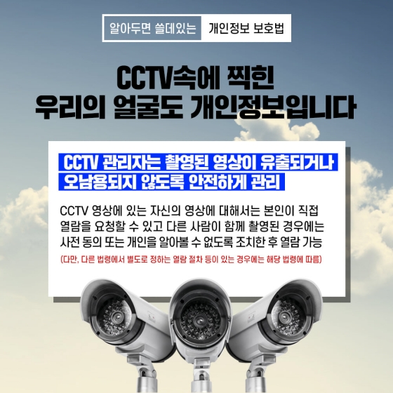 CCTV로 촬영된 영상은 개인 정보로 간주되며, 이에 따라 CCTV 운영자는 촬영된 영상을 안전하게 관리해야 합니다. 개인은 자신의 영상에 접근할 수 있는 권리가 있으며, 이를 통해 개인정보 보호가 이루어집니다.