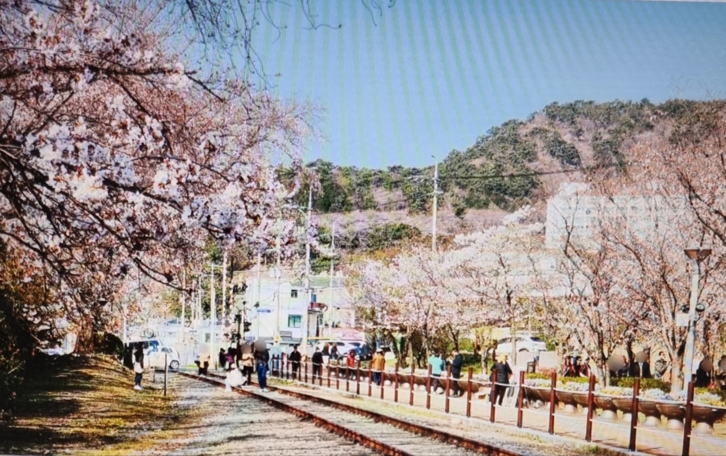 기찻길을 따라 벚꽃이 만개한 모습은 마치 영화 속 한 장면 같습니다.